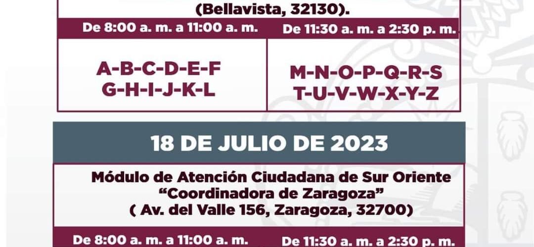 Mencionó que el lunes y martes se atenderá en dos horarios, por lo que de 8:00 a 11:00 de la mañana se recibirá a las personas con apellidos que inicien con A,B,C,D,E,F,G,H,I,J,K,L y de 11:30 de la mañana a 2:30 de la tarde a los apellidos que empiecen con M,N,O,P,Q,R,S,T,U,V,W,X,Y,Z.