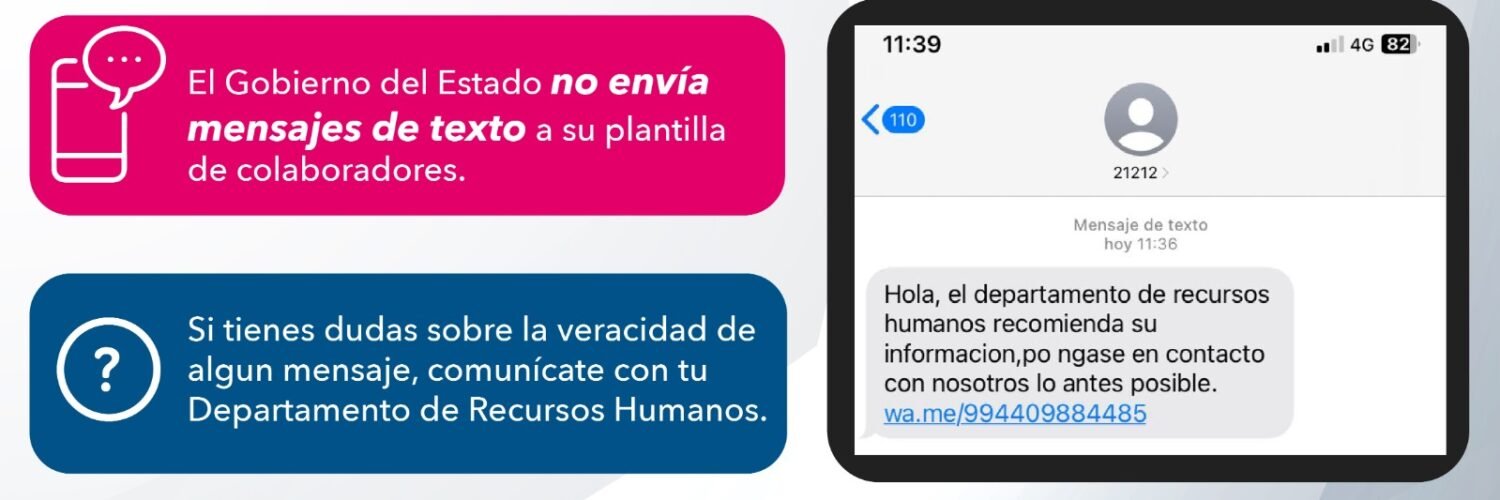 La Dirección de Recursos Humanos de la Secretaría de Hacienda, emitió una alerta dirigida a las y los trabajadores del Gobierno del Estado, para que eviten ser víctimas de una posible estafa o del robo de sus datos personales, a través de un mensaje de texto que es enviado a sus teléfonos móviles.