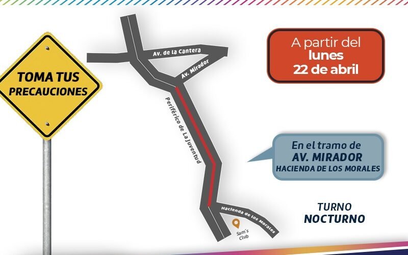 A partir del lunes 22 de abril se informa a la ciudadanía que se iniciará con las labores de intervención en el camellón central del Periférico De la Juventud, entre la avenida Mirador y la calle Hacienda Los Morales, en turno nocturno con un horario de las 10:00 pm a las 5:00 am.