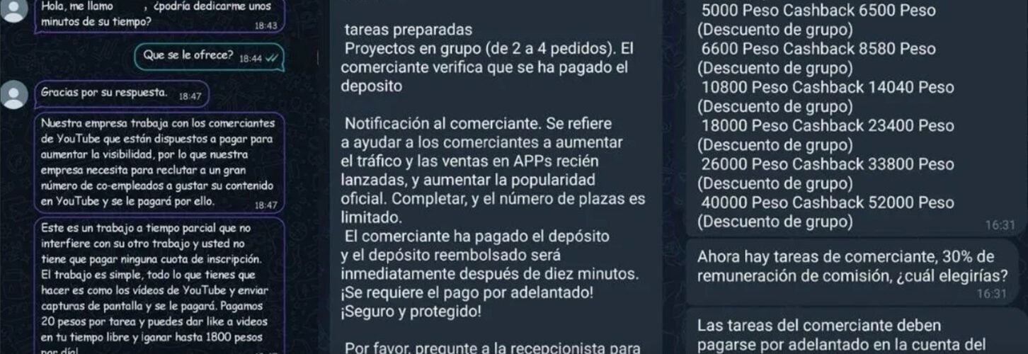 Según informan de manera anónima, el modus operandi de los estafadores consiste en contactar a personas directamente por su WhatsApp, ofrecer dinero a cambio de ‘likes’ a determinados vídeos de sus comerciantes en YouTube.