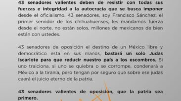 El diputado y dirigente estatal de Movimiento Ciudadano, Francisco Sánchez Villegas, envió una carta a los 43 senadores que integran la oposición para urgir a actuar con...