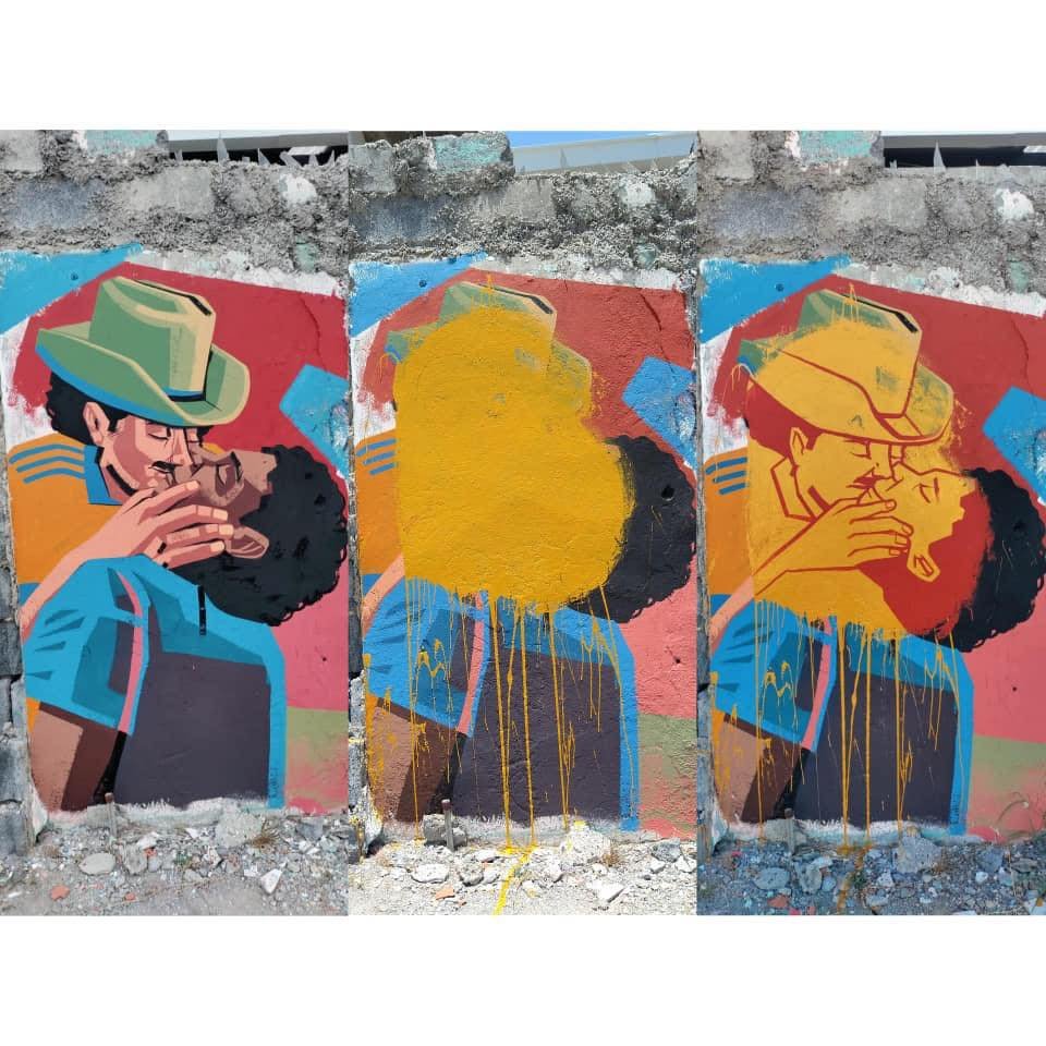 Una persona trató de censurarla colocando una mancha de pintura color amarilla, pero Alejandro Guerrero plasmó encima la imagen de los dos hombres besándose. En uno de...