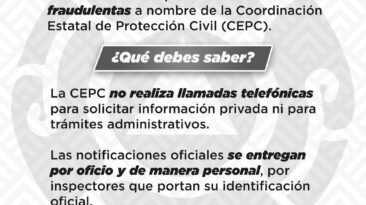 La Coordinación Estatal de Protección Civil (CEPC), alerta a la ciudadanía ante una serie de denuncias recibidas respecto a llamadas apócrifas, de individuos que se...