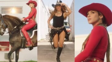 Enfundada en un traje ajustado de cuero rojo, con sombrero de cowboy a juego y montada a caballo o bailando al más puro estilo mexicano con un vestido negro de flecos...