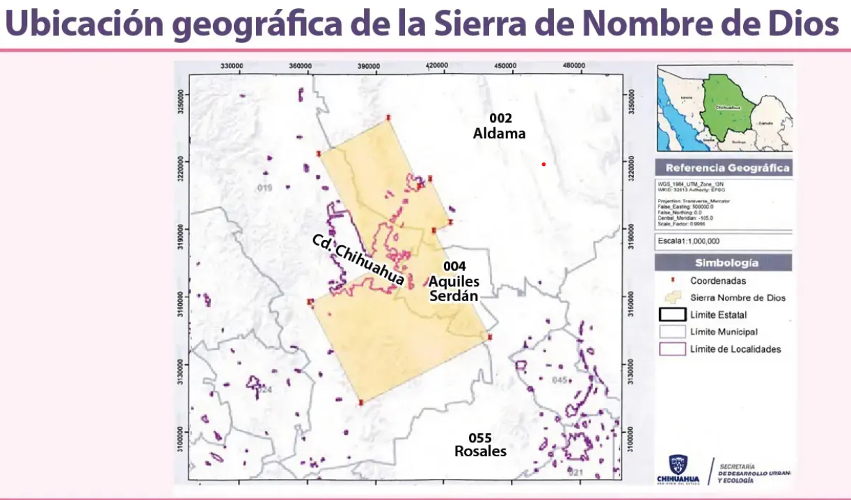 El objeto de la Consulta pública Sierra de Nombre de Dios, es que las y los habitantes de los municipios de Aldama, Aquiles Serdán, Chihuahua y Rosales, expresen sus opiniones y propuestas sobre la urgencia e importancia de que la Sierra de Nombre de Dios, sea declarada como monumento natural (área natural protegida). Una área natural protegida es una parte del territorio del país que recibe una protección legal especial para cuidar y conservar el espacio en que viven plantas, animales y el paisaje natural.