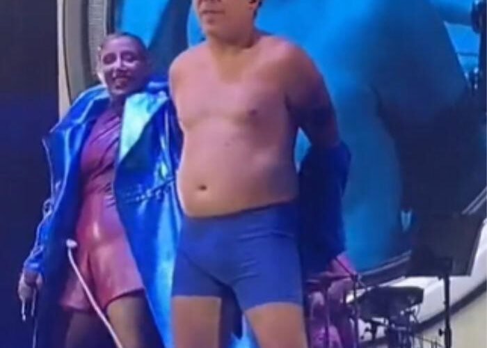 El hijo de Verónica Castro apareció en el escenario luciendo un conjunto deportivo color azul rey, el cual combinó con calzado del mismo tono. Sin embargo, al terminar la canción, Cristian Castro se quitó la sudadera y quedó únicamente en licra.