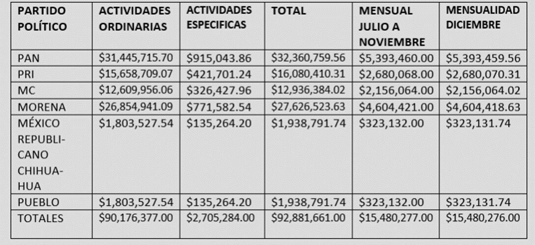 El Consejo del Instituto Estatal Electoral de Chihuahua (IEE), en su 14ª Sesión Extraordinaria, aprobó la redistribución del financiamiento público local de partidos políticos, para actividades ordinarias y específicas, correspondiente a los meses de julio, agosto, septiembre, octubre, noviembre y diciembre del año 2023.