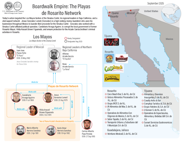 Además de designar a las personas clave alineadas con Los Mayos en la red de Playas de Rosarito, la OFAC también apuntó a 14 empresas propiedad de González: JR Alimentos Del Mar , S. De R. l . Dic . V .; Grupo JRCP , S. De R. L .; Sabor Tapatío , S. De R. l . Dic . V .; Gotoco Alimentos Procesados S . De R. l . Dic . V .; Grupo Hotelero JJJ , S. A . Dic . V .; Complejo Turístico JJJ , S. A . Dic . V .; Operadora De Espectaculos , Alimentos Y Bebidas J&R S. A . Dic . V .; Alimentos Y Desvío Insurgentes , S. De R. l . Dic . V .; Sunset Servicios Gastronómicos S . De R. l . De C . V .; JJ Gonver S . De R . L . De C . V .; Operadora De Alimentos Con Orígenes De México , S . De R . L . De C . V .; Veintiuno Mexicali , S . De R . L . De C . V .; Coco Beach Bar , S . De R . L . De C . V .; y, Cavally Antro & Bar . Estos negocios están siendo designados de conformidad con EO 14059, y de conformidad con EO 13224, según enmendado, por ser propiedad de, controlados o dirigidos por, o haber actuado o pretendido actuar para o en nombre de, directa o indirectamente, Gonzalez.