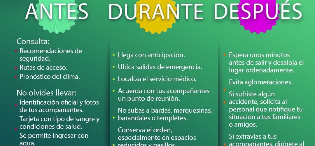 Al asistir a los eventos vestir ropa y calzado cómodos, protegerse del sol con bloqueador, gorra o sombrero, mantenerse hidratado e informarse sobre la duración del evento, las formas de acceso y buscar la ruta más segura para llegar a tiempo.