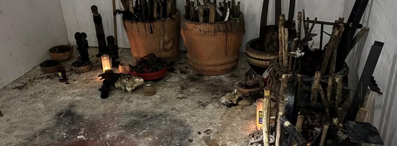 Del lado derecho también hay imágenes talladas en madera y una vasija con una imagen que simula una cabeza humana con sangre. Es una especie de altar lo que se localizó en la casa situada en Cuernavaca.
