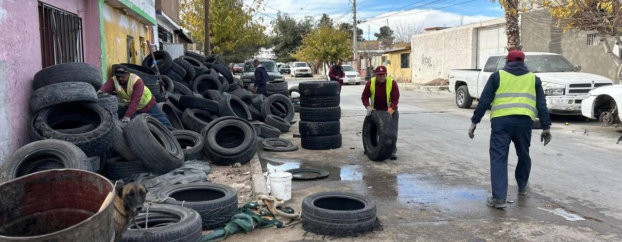 Personal de la Dirección de Limpia, en coordinación con Ecología y Protección Civil, retiró más de 2,500 llantas en desuso acumuladas en el techo, frente e interior de una vivienda ubicada en la calle Namibia, en la colonia Campestre Virreyes.