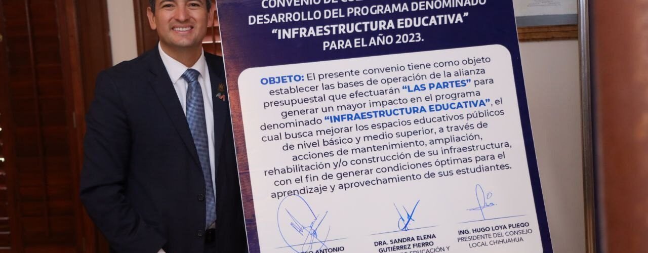 El alcalde Marco Bonilla, la secretaria Estatal de Educación y Deporte, Sandra Elena Gutiérrez Fierro, y el presidente de la Fundación del Empresariado Chihuahuense (FECHAC), Hugo Loya, firmaron un convenio para invertir más de 39 millones en mejoras a la infraestructura de escuelas públicas, como parte del compromiso para el desarrollo de las niñas, niños y jóvenes estudiantes de Chihuahua Capital.