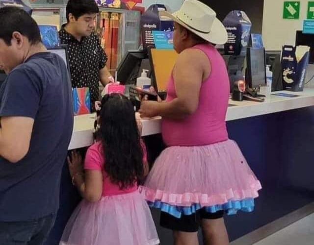 En su publicación, el señor Eleazar contó que su hija le pidió que portara algo de color rosa para ir a ver el filme, pero que seguramente al hacerlo “le daría pena”, según la pequeña. Pues el plan del papá no pudo ser más ambicioso: decidió deshacerse de cualquier estigma y diseñó un vestido de color rosa, acompañado también por una camiseta del mismo color y hasta el sombrero, para completar el conjunto y que no quede ninguna duda de la intención por cumplir el deseo de su hija. “Creo que a la que va a dar vergüenza será a ella”, escribió en su publicación a modo de broma.