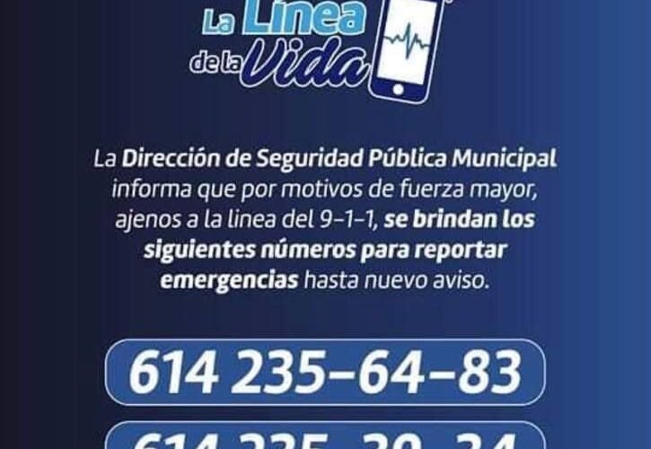 Ante fallas ajenas, que se han venido presentando desde esta madrugada, en la línea de emergencias 9-1-1, la Dirección de Seguridad Pública Municipal (DSPM) informa que mientras se restablece el servicio se ponen a disposición de la comunidad los números: 614-235-64-83, 614-235-39-34 y 614-196-55-50.