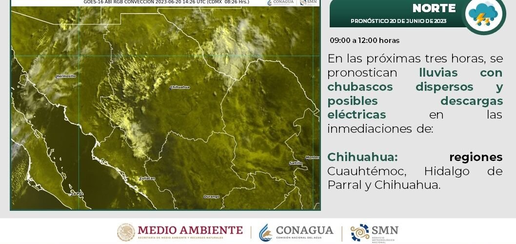 Con base en la información emitida por el Servicio Meteorológico Nacional (SMN), se esperan lluvias en Buenaventura, Namiquipa, Guachochi, Balleza, Ahumada, Ignacio Zaragoza, Guerrero, Bocoyna, Guadalupe y Calvo, Cuauhtémoc, Chihuahua, Delicias, Camargo, Jiménez, Parral, Coyame y Ojinaga.