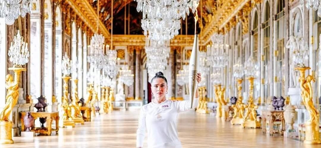 Salma Hayek portó la antorcha olímpica en Versalles, París, previo a los Juegos Olímpicos que inician este viernes.