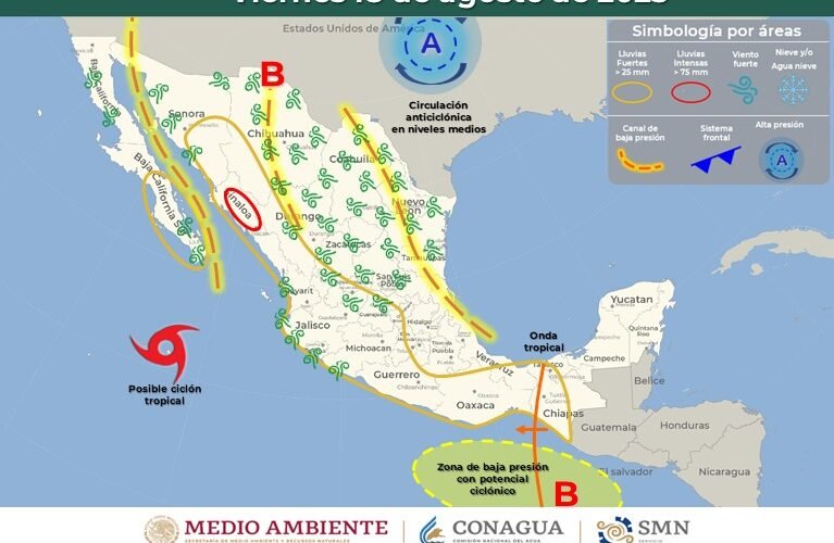 En tanto, para los días jueves 17 y viernes 18 de agosto el monzón mexicano estará activo sobre el noroeste de México, interactuando con divergencia en altura, circulación anticiclónica en niveles medios de la atmósfera y un canal de baja presión.