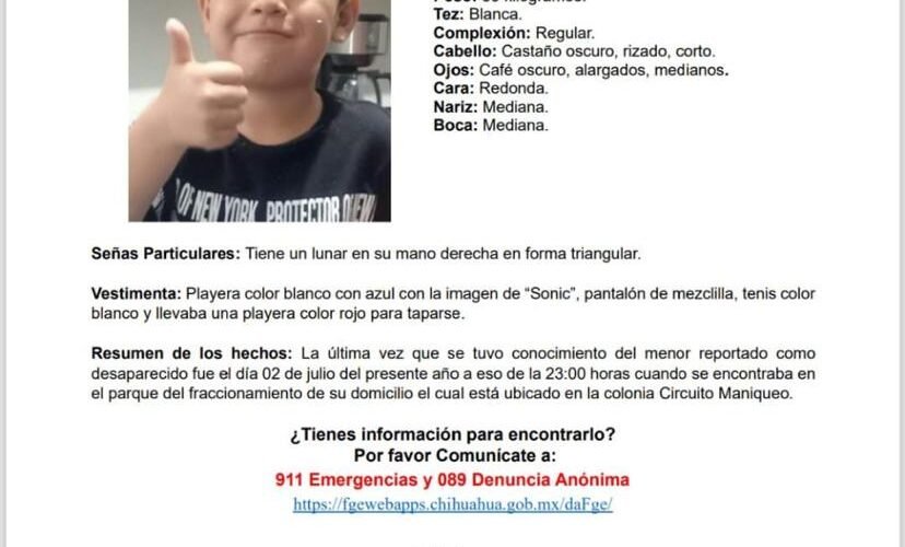 Personal de la Comisión Local de Búsqueda, la Agencia Estatal de Investigación y grupos de K9, se sumaron a los operativos de búsqueda para localizar al niño Jasiel Giovanny Castellano Loya, de 8 años de edad, visto por última ocasión en la colonia Circuito Maniqueo, al sur oriente de la ciudad de Chihuahua.