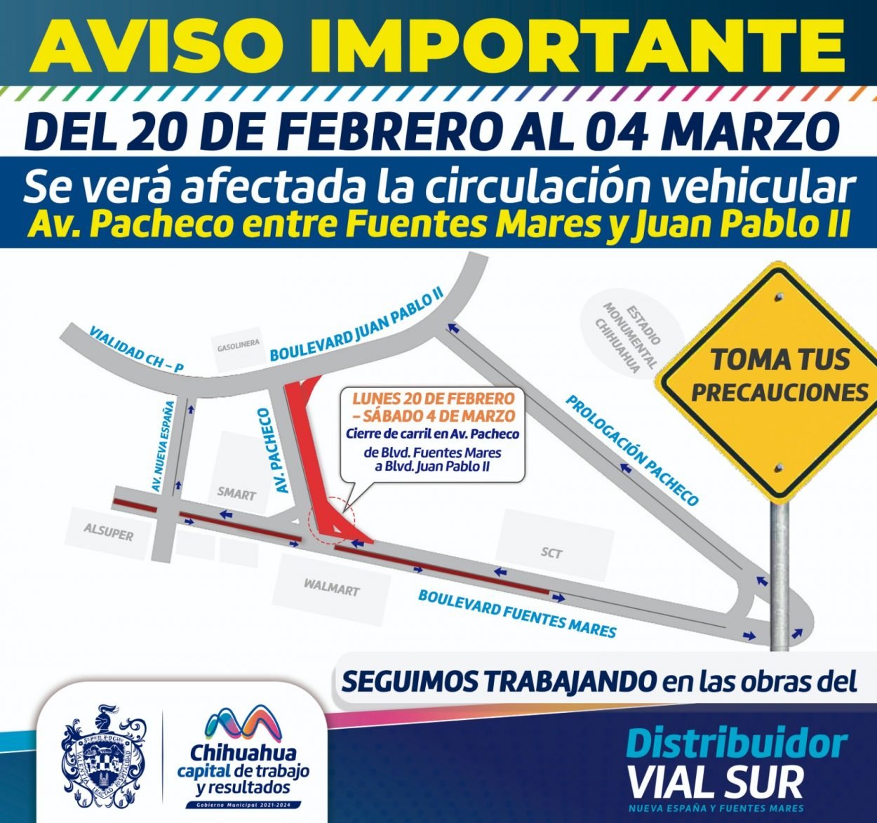 Estatal ¡Aviso Importante! Del 20 de febrero al 4 de marzo se verá afectada la circulación vehicular en avenida Pacheco 2 min de lectura