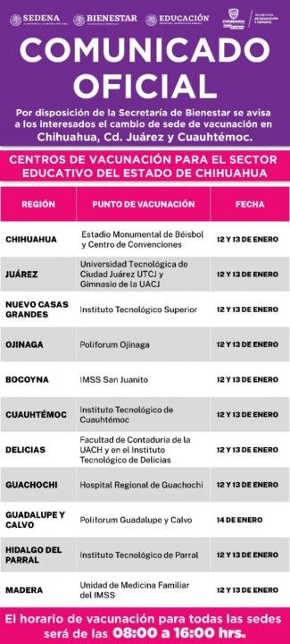 Estatal Informa SEyD al personal educativo sobre cambio en sedes de vacunación en Chihuahua, Juárez y Cuauhtémoc 3 min de lectura