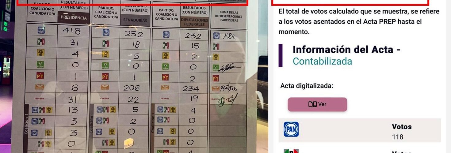 Las entradas muestran una instantánea de un cartel con un conteo de votos y una captura de pantalla del sitio web del PREP con otro registro de sufragios con datos distintos.