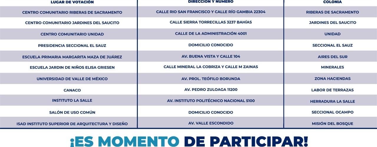 La distribución de espacios destinados a la elección, se encuentra distribuida en los cinco distritos en la ciudad y cada uno de los centros contará con una persona encargada del personal, misma que fue previamente capacitada para resolver cualquier situación que se presente durante la consulta, así como brindar apoyo a los votantes o bien aclarar las dudas que surjan durante la dinámica.